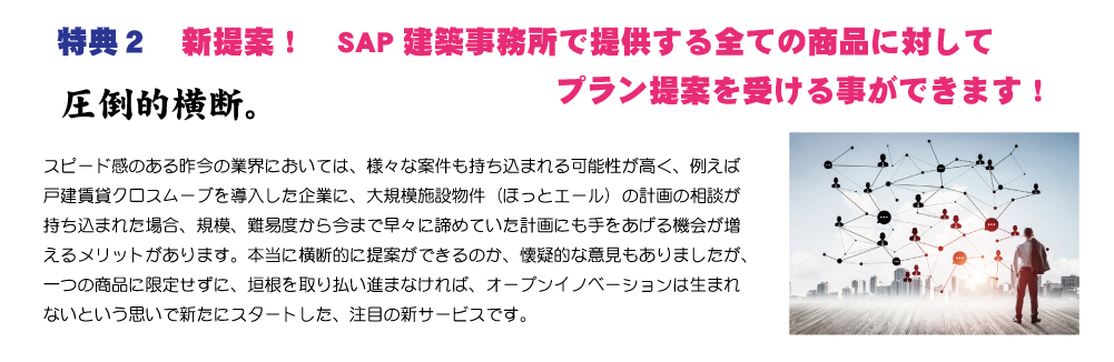 オーナー様、運営事業者様、建設企業3者が共に喜ぶツーバイフォー建築づくりのサポートを、実績豊富な私たちSAPが進めていきます。