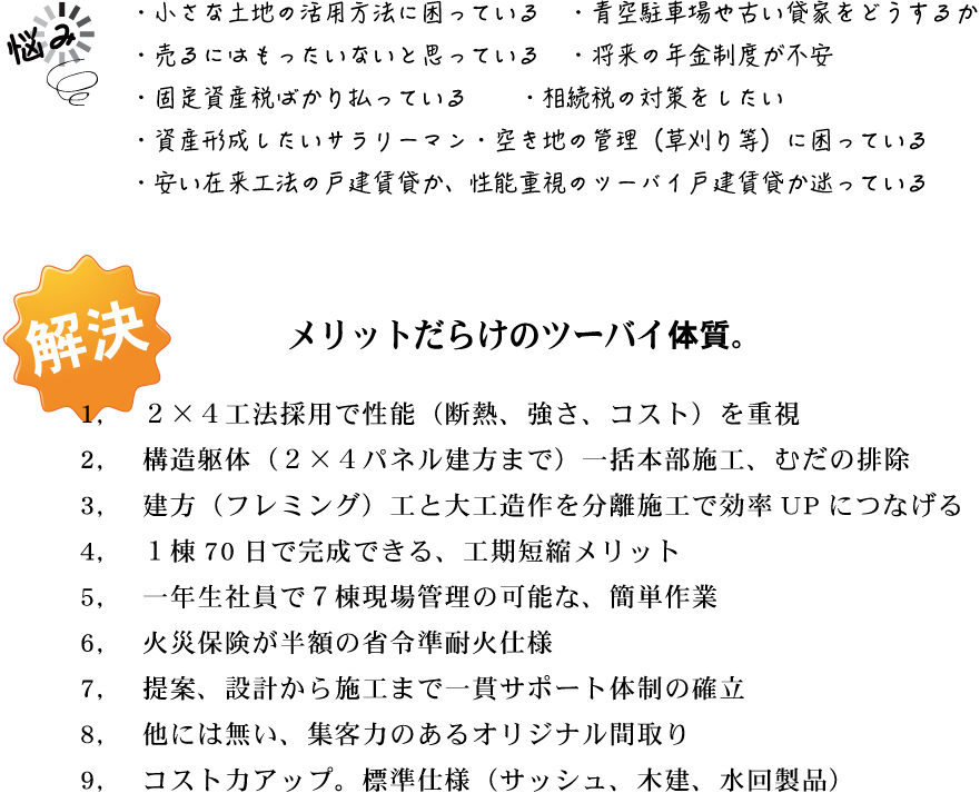 建物の本体価格を如何に削減していくかが、事業成功の近道でもあり課題でもあります。2×4のメリットでもあるコストダウン。工場でパネルを製作するので昨今の職人不足、単価の高騰にもあまり左右されず更にプランの企画、規格化で工期短縮を実現。勝つ商品づくりが可能です。