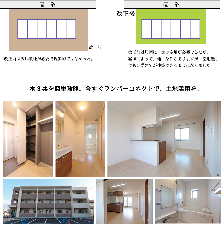 木造2×4工法ですが、H27年の法改正によって、今まで周囲に3Mの空地が必要でしたが、緩和によって、一回り小さな敷地でも、準耐火構造で3建てまで建築が可能になりました。(木三共)2層であきらめていた計画を思い切って3層にして土地の利回りを上げる計画が可能になります。