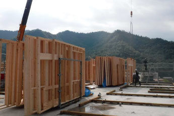 工場で製作した精度の高いパネルを現場で組み立てる作業につき、1階から床を組んでいくので安全性が高く、合理的な工法であり、建設品質精度の高さでは定評があります。またその建設工程は建て方終了後の工期、労務費は20%から25%の削減に貢献。