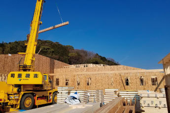 木造2×4工法は、全国各地のパネル工場で製作されたパネルを現場で組み上げていきますので、工期短縮に繋がります。それに加えて、私たちのプロジェクトに賛同頂いている、優秀なフレ―マー(2×4工法の建方を行う専門の技術者)が建方工事を請負いますので、品質はもちろん工期短縮にも貢献します。