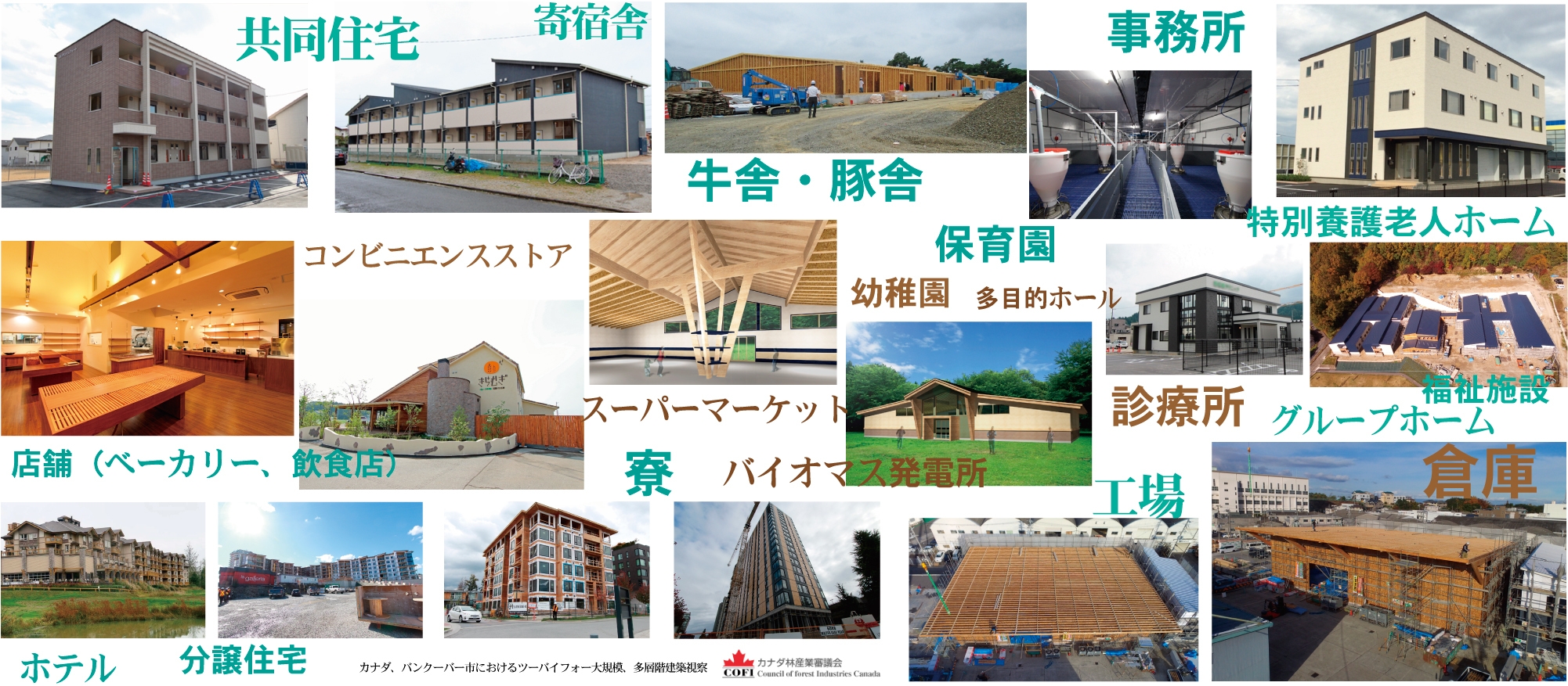 下段左四枚の写真は、バンクーバー市近郊におけるカナダ林産審議会主催の研修での写真です。