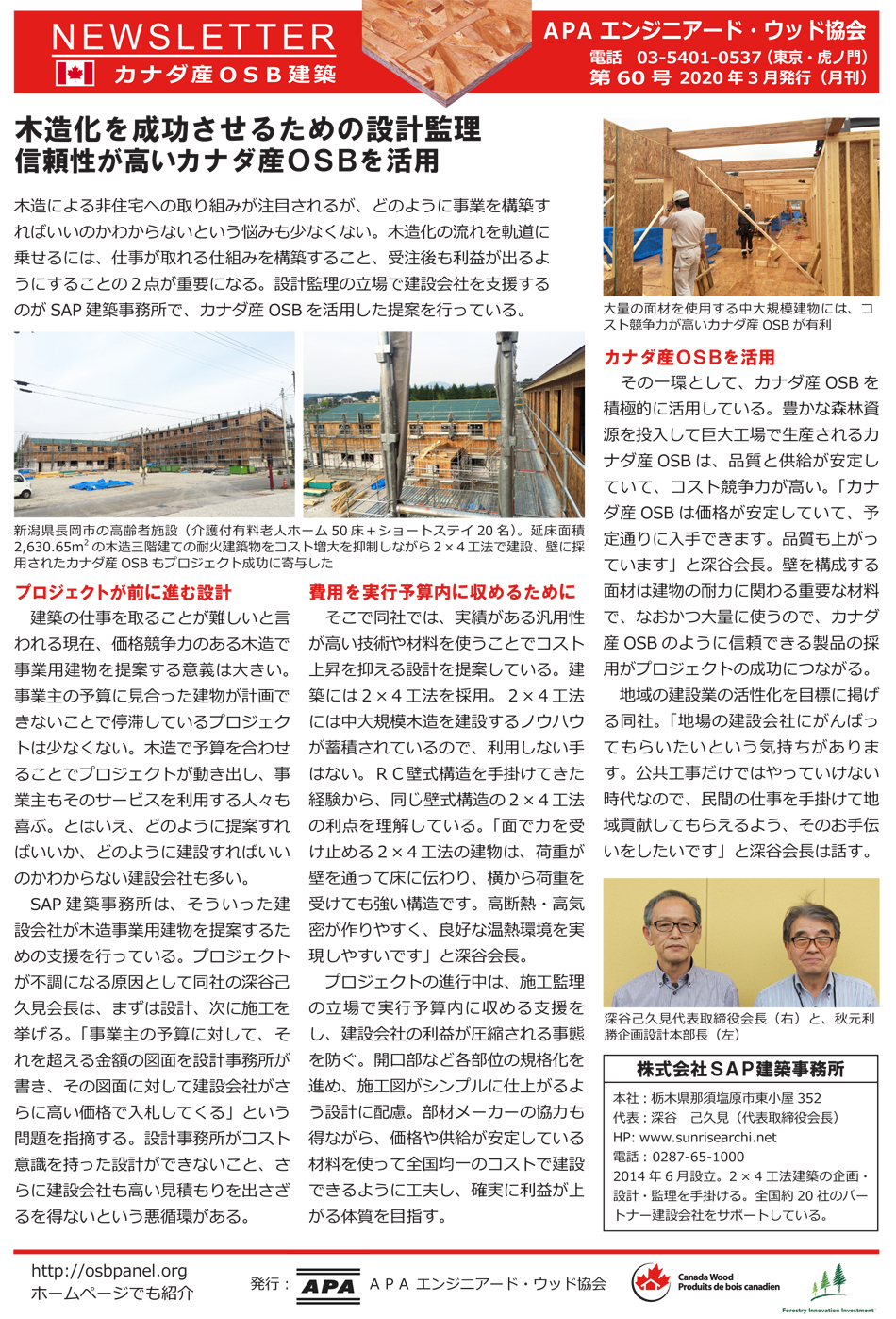 この度APA エンジニアード・ウッド協会様の取材を受け、弊社のCM、コストを意識した規格化された建築計画への取組みや、建設会社の木造化への支援の内容、がレポートされています。